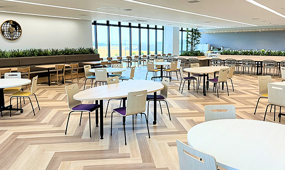 また、2階は事務室、CAD/CAM室、会議室、多目的ホールなどがあり、全て広い空間で、特に多目的ホールは最も広く、特注のプランターボックスを含めたカフェテリア風の空間になっており、普段は社員食堂ですが、セミナー会場や講演会会場にも変更でき、更には最大130名の盛大なイベントにも利用できます。