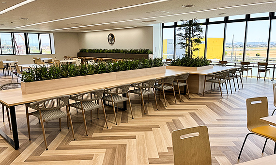 また、2階は事務室、CAD/CAM室、会議室、多目的ホールなどがあり、全て広い空間で、特に多目的ホールは最も広く、特注のプランターボックスを含めたカフェテリア風の空間になっており、普段は社員食堂ですが、セミナー会場や講演会会場にも変更でき、更には最大130名の盛大なイベントにも利用できます。