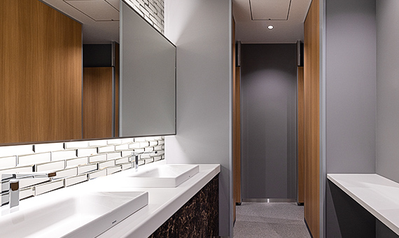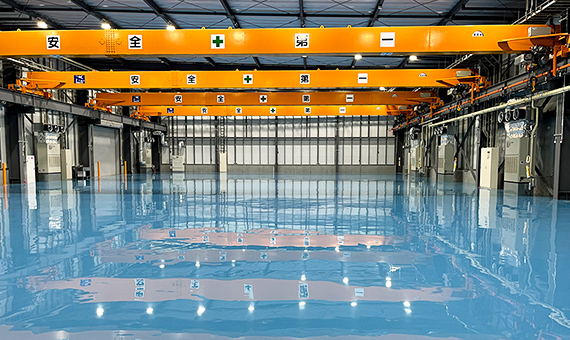 工場内は冷暖房完備で、特に恒温工場は23.5℃±1.5℃の環境です。工場は全てLEDライトでかなり明るく、床はアクアブルー色で、まるで湖の上で仕事をしているかの様な気持ちになれます。そして本社及び工場内の全てのトイレは、あの有名な刈谷ハイウェイオアシス並みに広くエレガントに仕上げました。